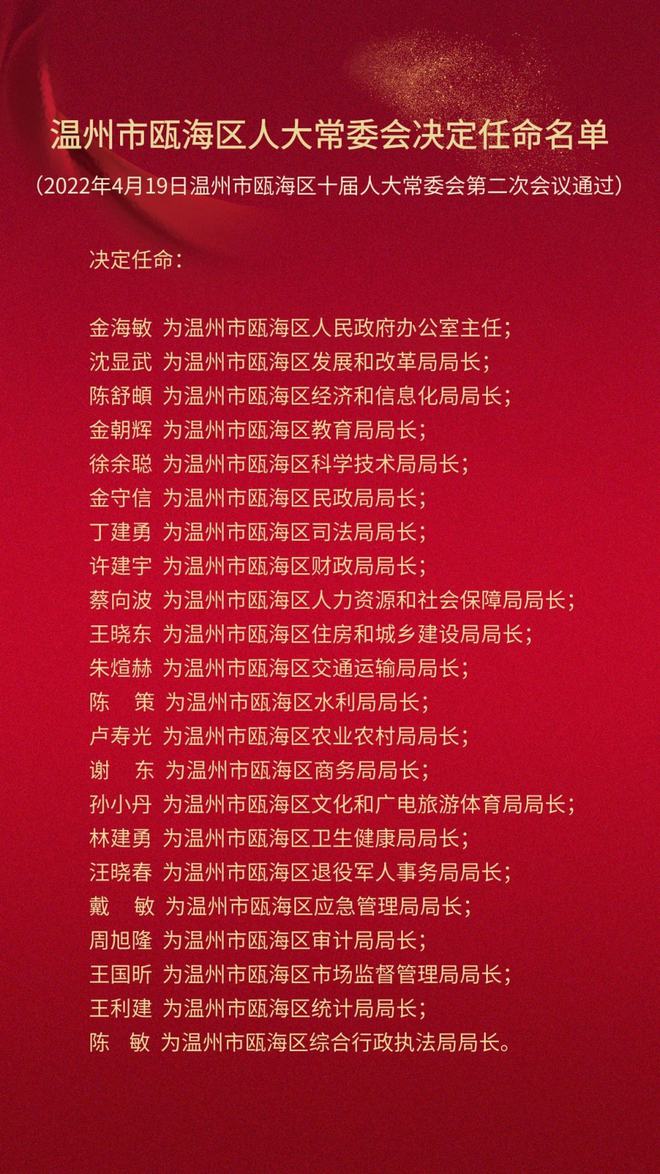 永嘉縣的人事任免消息一直備受各界關注,永嘉縣再次進行了一系列人事任免調整,本文將為您詳細解讀這一最新的人事變動,帶您了解新任領導人的背景與任務,洞察永嘉縣未來的發展動向。